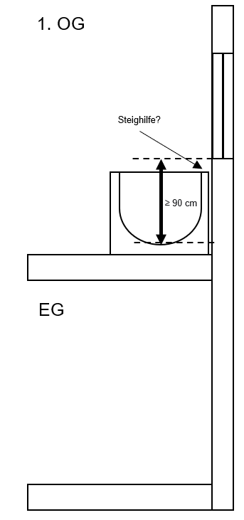 Vom Boden der Badewanne bis OK Fensterstock sollen bei geöffnetem Fenster mind. 90 cm sein bzw. 1,10 cm bei Geschossen über 12 m Höhe. Ergibt sich eine Höhe von unter 90 cm, muss außen noch ein Brüstungsstab angeordnet werden. Dieser kann am Fensterstock oder im Mauerwerk befestigt werden.